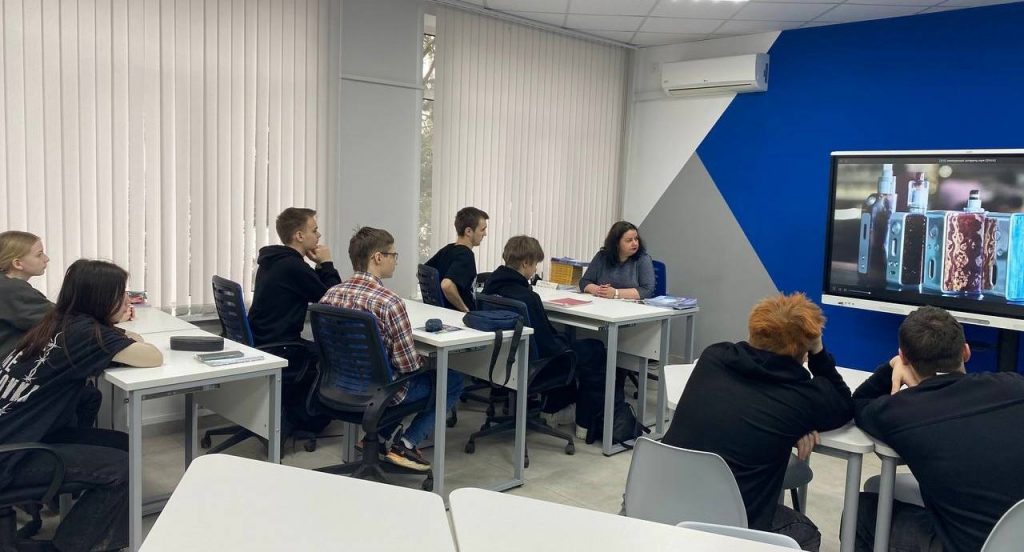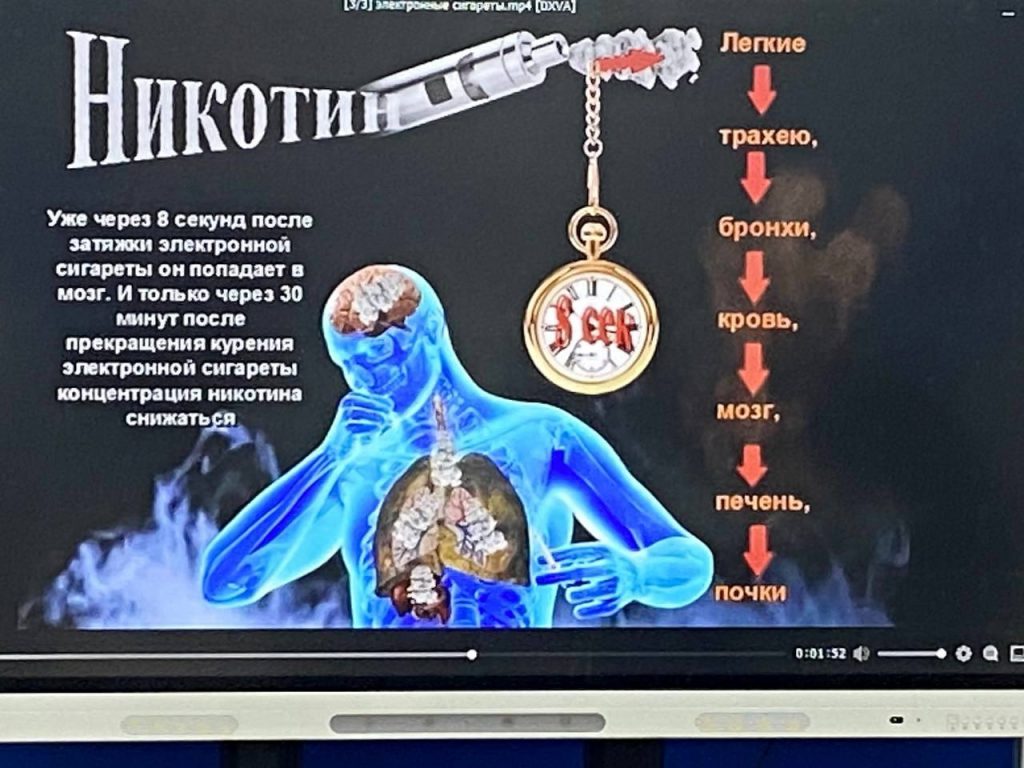 Беседа проходила с показом видеоролика. Затронуты вопросы: «Какой вред наносит курение вейпа подросткам?», «Курительный состав смеси», «Влияние вейпов на мозг и психику, на здоровье полости рта», что будет, если курить их постоянно?