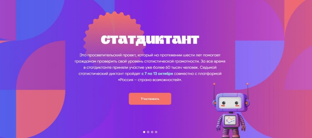 Этот проект на протяжении семи лет помогает гражданам России проверить свой уровень статистической грамотности. Участники отвечали на 30 вопросов в 6 тематических блоках. Задача мероприятия заключалась не только в обучении методикам обработки и анализа информации, но и в воспитании у молодого поколения осознанного отношения к данным, необходимым для успешной работы в современном цифровом мире.