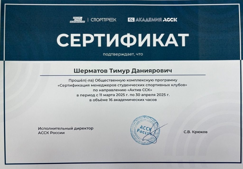 Студент группы ОИБ-31 Шерматов Тимур в рамках образовательной программы Общероссийской молодёжной общественной организации «Ассоциация студенческих спортивных клубов России» прошёл обучение по общественной комплексной программе «Сертификация менеджеров студенческих спортивных клубов» по направлению «Актив ССК» и получил сертификат.