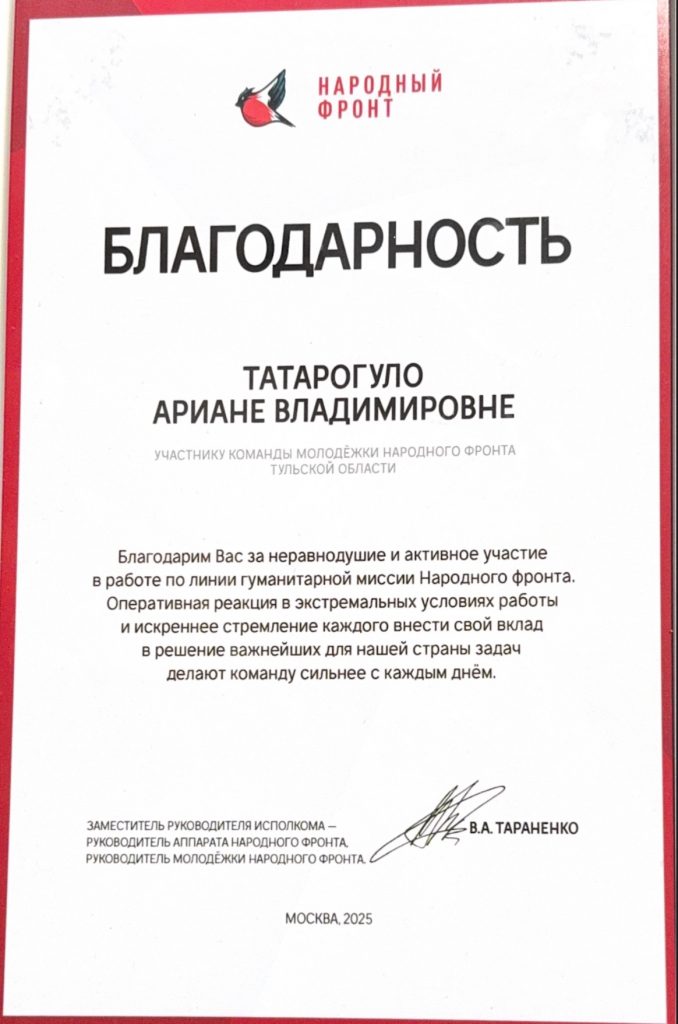 Студентка 3 курса группы ОП-31 Ариана Татарогуло проявила активную гражданскую позицию, приняв участие в гуманитарной миссии.
