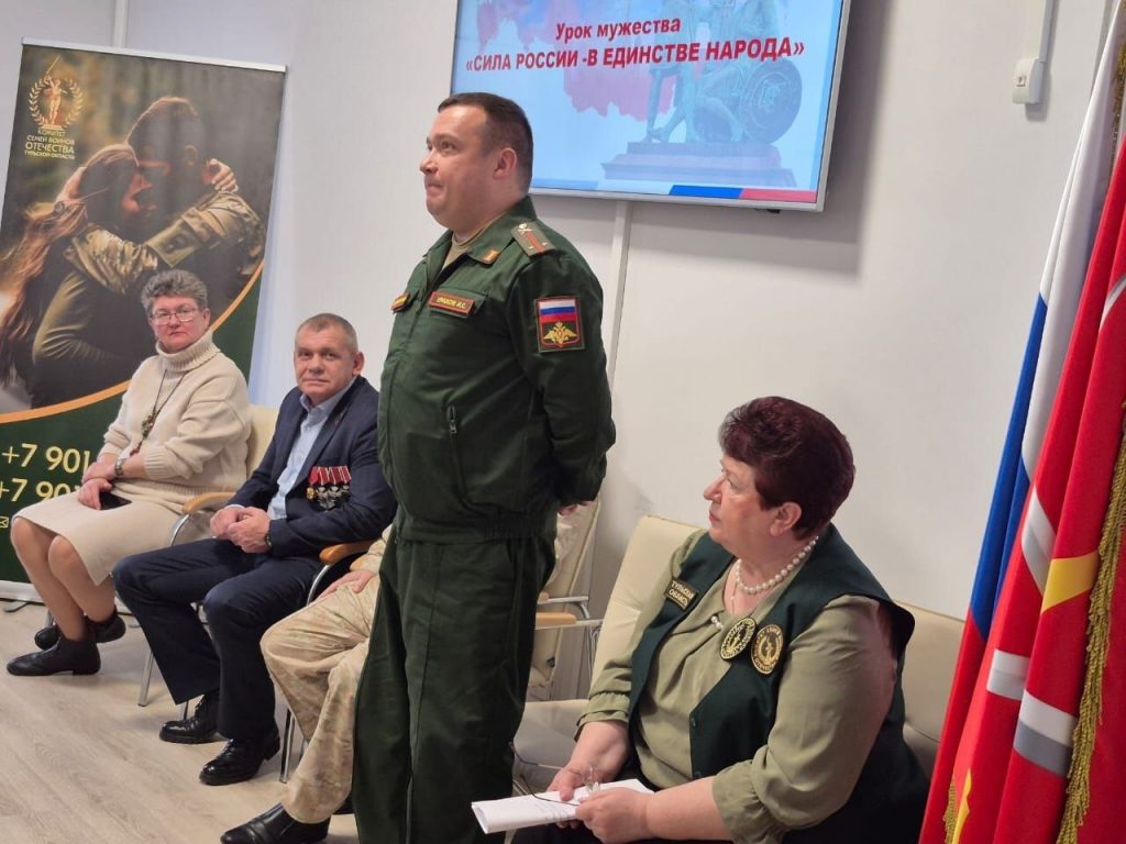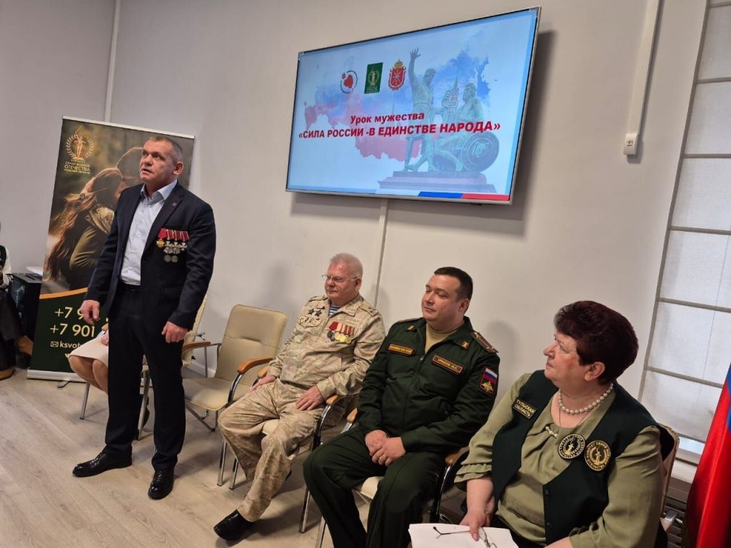 Этот праздник — один из самых молодых, однако его исторические корни уходят в глубь веков, напоминая о том, что сплоченность, взаимовыручка, любовь к Родине, помогли нашему народу преодолеть самые тяжелые испытания, демонстрируя, что сила России в сплоченности ее народа.Символично, что патриотический эмоциональный заряд уроку придала песня — «Россия — это мы», в исполнении члена регионального отделения Всероссийского студенческого корпуса спасателей Дианы Карасёвой. Песня объединила участников, все слушая стоя, плечо к плечу.Яркий пример самоотверженности, доблести, любви к Родине продемонстрировали гости урока — люди с героической судьбой.