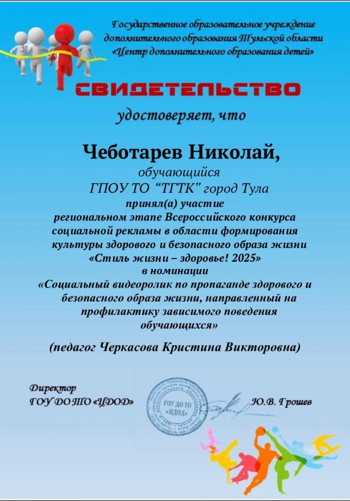 Студент группы ПТМ-41 Чеботарев Николай принял участие во Всероссийском конкурсе социальной рекламы в области формирования культуры здорового и безопасного образа жизни «Стиль жизни — здоровье! 2025» в номинации «Социальный видеоролик по пропаганде здорового и безопасного образа жизни» (преподаватель Черкасова К.В.).