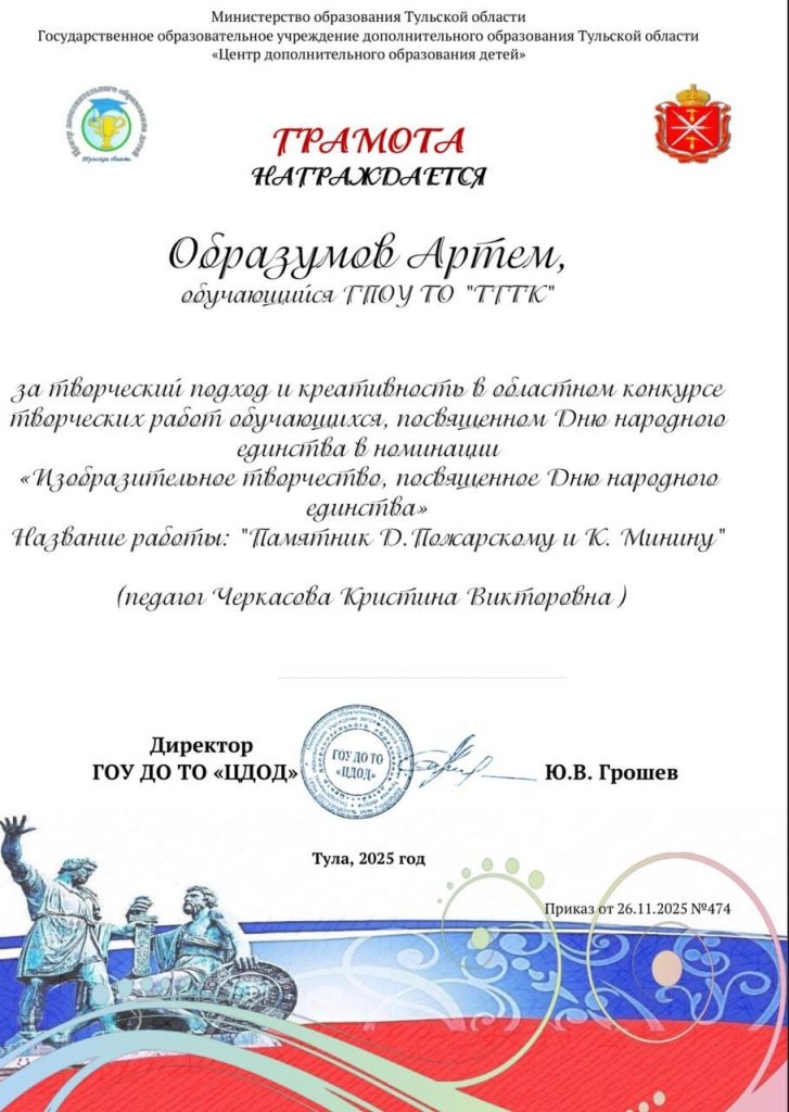 Студент группы ПТМ-41 Образумов Артем принял участие в ежегодном традиционном областном конкурсе творческих работ обучающихся, посвященном Дню народного единства.