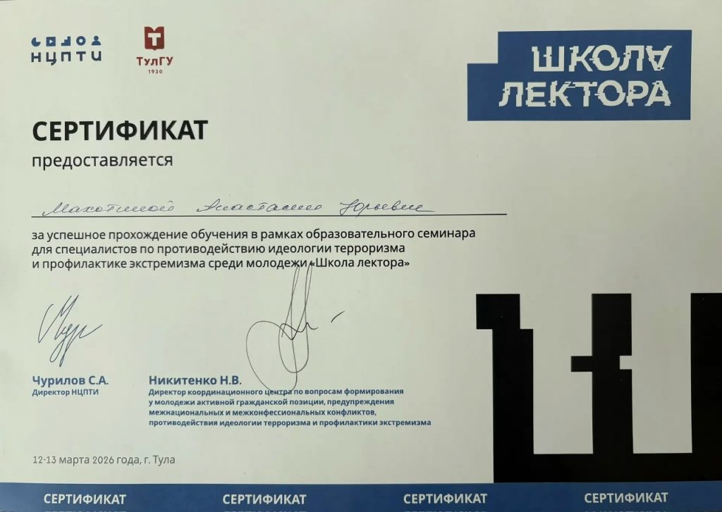 С 12 по 13 марта 2026 года советник директора по воспитанию Махотина А.Ю. принимала участие во Всероссийском образовательном семинаре «Школа лекторов», проходившем в Тульском государственном университете . Мероприятие призвано способствовать противодействию идеологии терроризма и профилактике экстремизма среди молодёжи.
